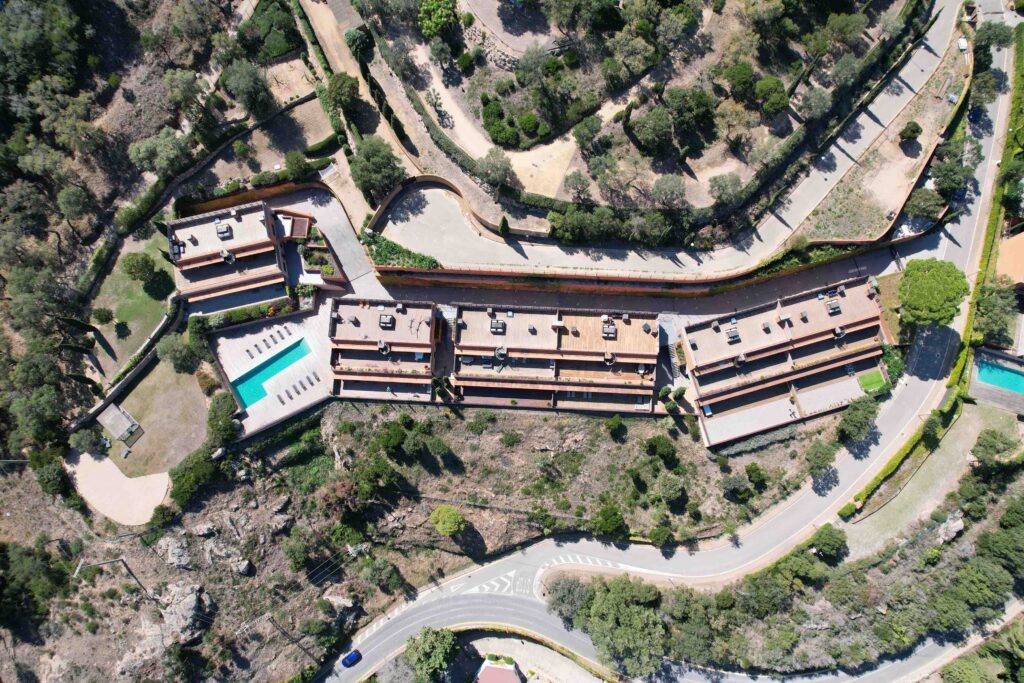 The plot has a very steep slope and the views from the plot are towards the sea. On the upper part of the plot there are 5 built volumes that make up a total of 12 dwellings with garage. In the lower part there are 4 more dwellings.