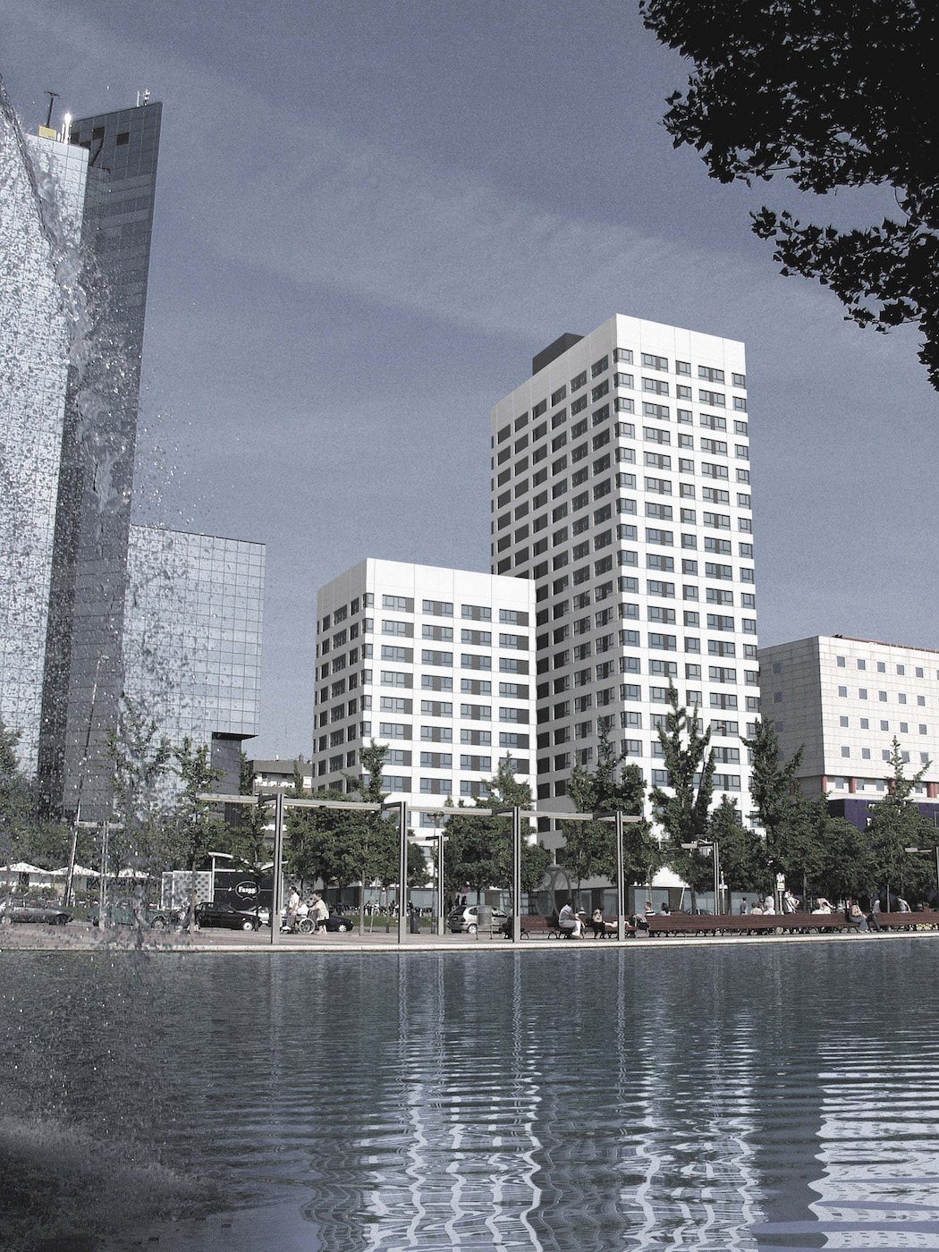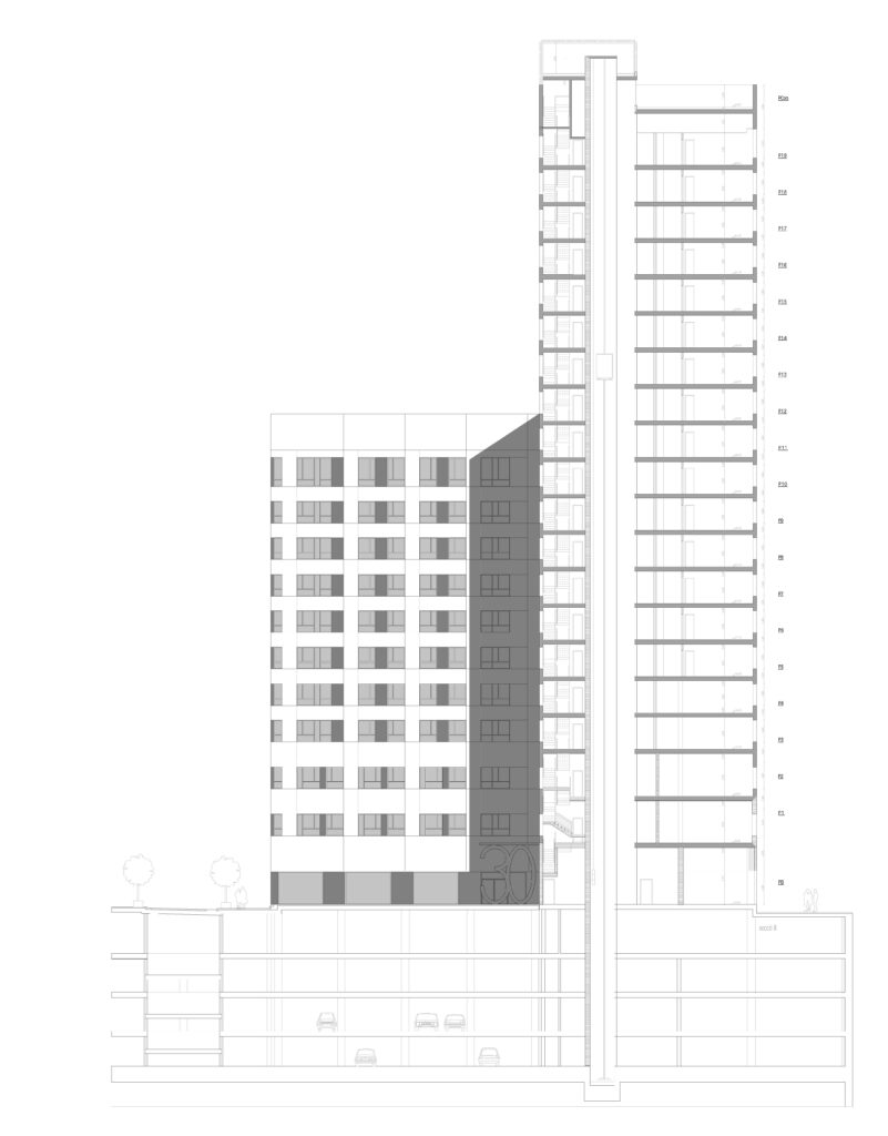 The new building maintains a similar massing to the existing tower, an abstract basic volume with no apparent scale. It consists of a high body, with GF+19, two staircases and two lifts, and a low body of GF+10 with one staircase and two lifts. However, Floors 9 and 10 of the lower level have access to one of the emergency staircases in the upper level, in order to comply with the regulations.