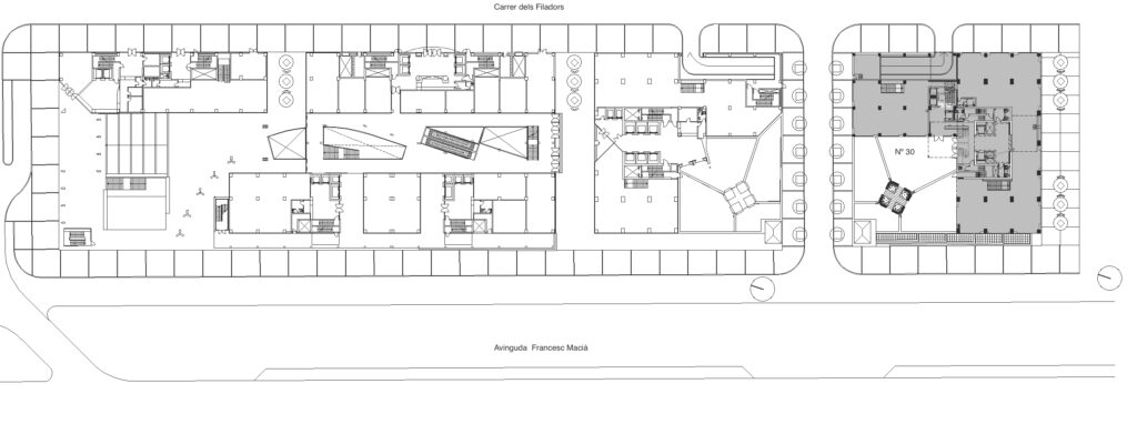 The difficult situation in the real estate market for offices in Sabadell in 2002 led the developer to replace the initially planned office building, symmetrical to the existing tower and the site of the new Sabadell courts, with the present project. The development consists of 98 flats, two office floors, with commercial premises on the ground, first, second and P-1 floors. We increased the number of floors, from GF+17 to GF+19, without increasing either the height (the height between floors of the flats is much lower than that of the offices) or the built surface (we cut back on the original volumes and reduced the surface area of the standard floors).