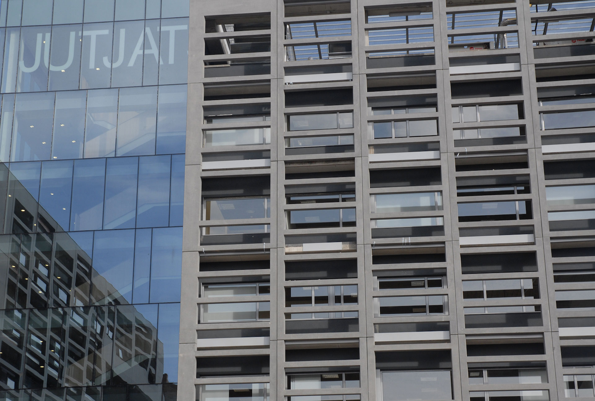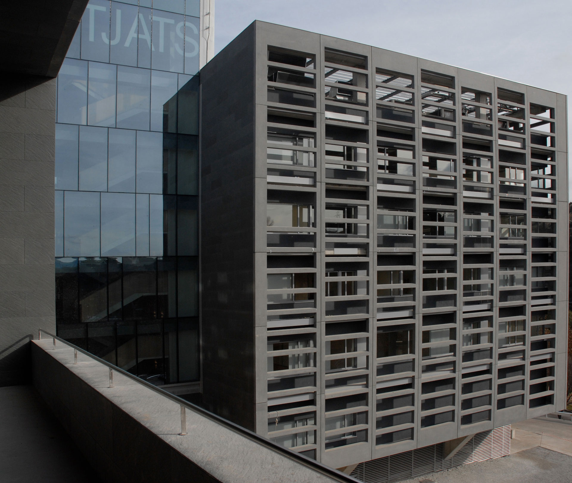 The north and north-east façades, facing the old town, have been clad with artificial stone using the ventilated façade system; the south and south-east façades have a double façade, with an outer skin, consisting of the artificial stone lattice, and an inner skin, with a traditional treatment. The function of the lattice is to act as a filter, both visually and from solar radiation in the hottest months, without significant loss of visibility. The central body, which houses the public vertical communications core, has a glass curtain wall enclosure.
