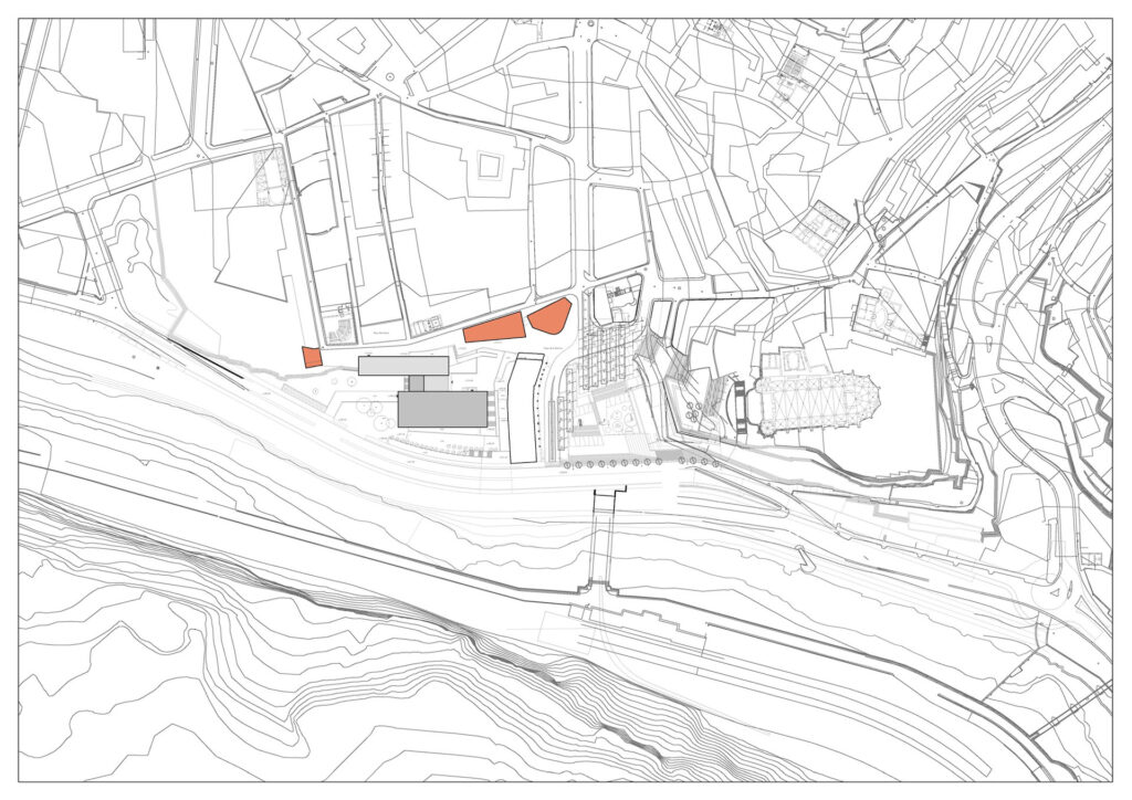 The project can be interpreted as the interplay of two simple solid forms with the rocky walls on the southern edge of the city: a main body, rotund and perfect, designed to be seen from a distance, with a lower and more elongated body, designed for short distances, touching the urban fabric, with a large gap, an intermediate and ceremonial space between the city and the building.