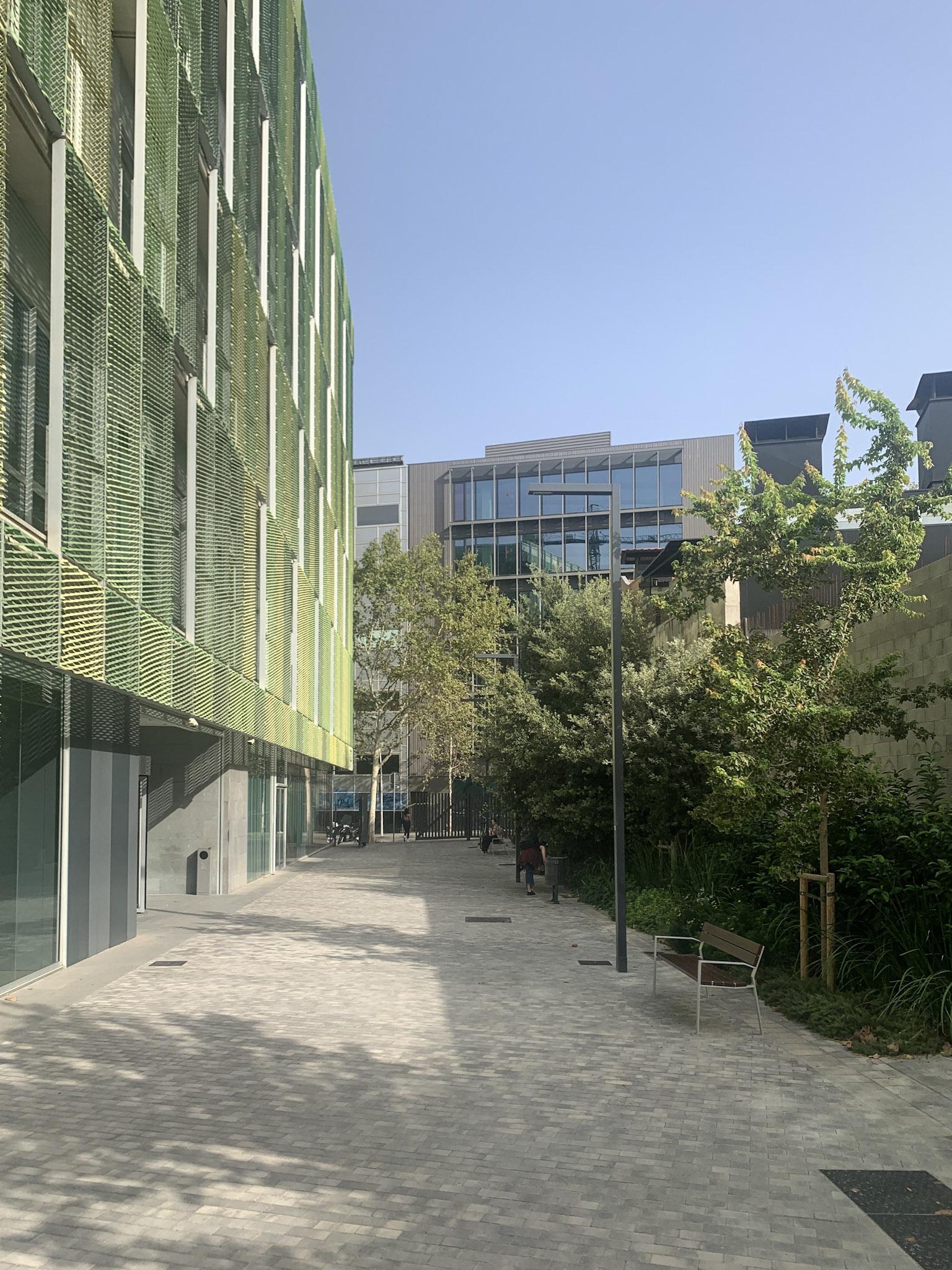A planting of medium-size trees shades the benches and marks an alignment in the passageway while a planting of ground-covering species adds colour and visually enriches the space.