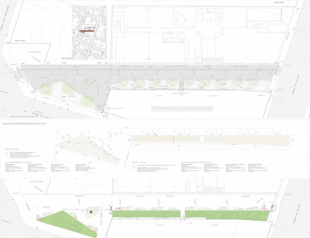 We have designed a passageway but also an open space, a green space with biodiversity. A pleasant place to spend time. The sunlight is very good, the south façade is one storey high. The paving, suitable for road traffic, is made of 10x20x10 cm architectural concrete paving stones, laid staggered with a cement joint and with a strip of grooved slabs as signposting for the blind. At either end of the passageway there are two newly constructed entrances for the passage of service and fire vehicles. In C/Zamora, which is a pedestrian street, a counter-slope is planned to allow the Can Feiner emergency exit to function correctly and to provide easy access to the passageway.