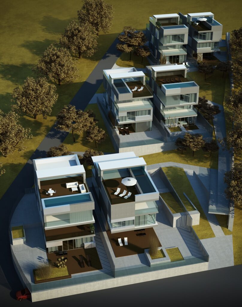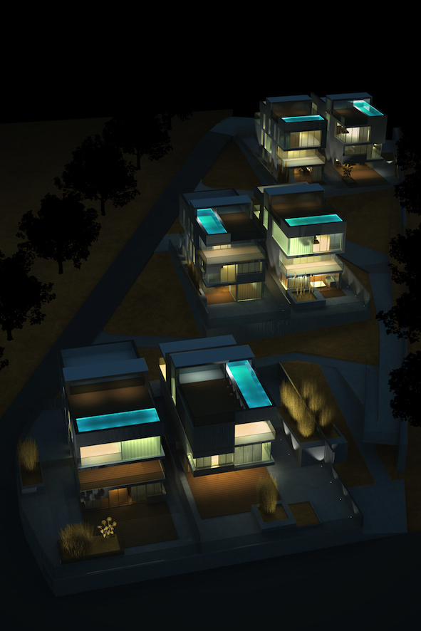 The basic layout of the ground floor comprises the main entrance, the living room, kitchen and a toilet. The living room has large openings and overlooks the garden area surrounding the houses. On the first and second floors are the bedrooms and studios with their corresponding services. On the roof there is a terrace limited by a sheet of water with a carefully designed composition.