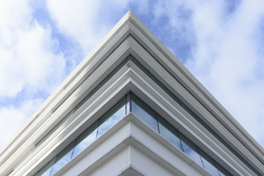 The massing is very clear: a concrete and glass mesh suspended 4 m above the ground, within its perimeter, two large courtyards serve the interior offices. The façade is a combination of white concrete and aluminium panels forming an orderly grid, in permanent interplay with the arbitrary position of the casement windows that are open during the day and the lights that are on at night.
