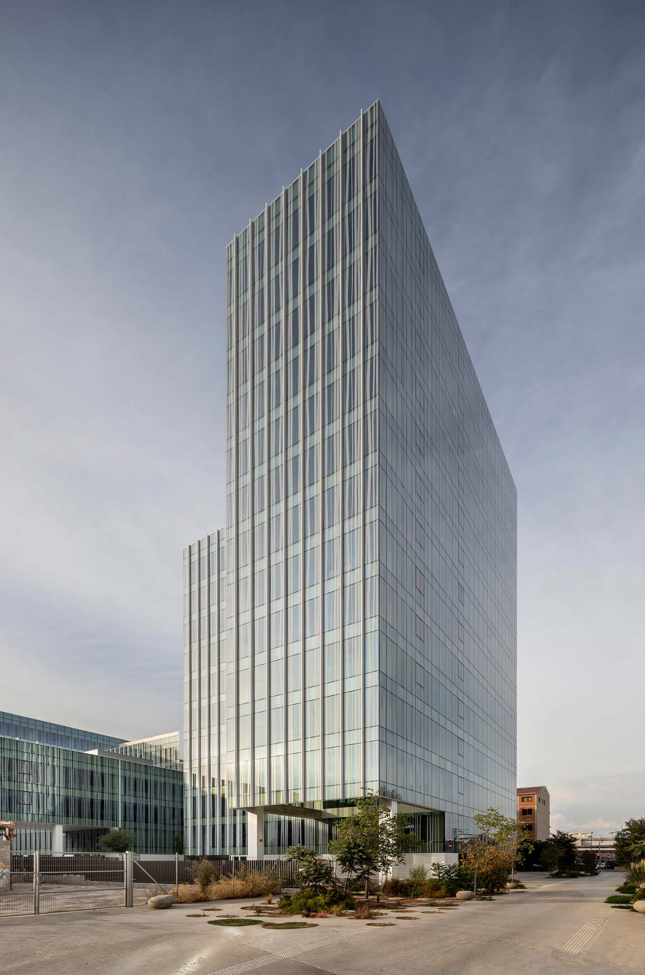 One skin, two textures, composite panel and screen-printed glass, in variable proportion and arrangement, allow us to give a uniform treatment to the envelopes of the built volumes, façades, roofs and exterior paving, allowing them to be understood as a whole, which is much more powerful than the sum of the individual volumes. The uniformity of the grid favours the shedding of scale references and enhances the massing. The openings and cut-outs in the volumes (external passages, access atriums) accentuate and qualify the whole.
