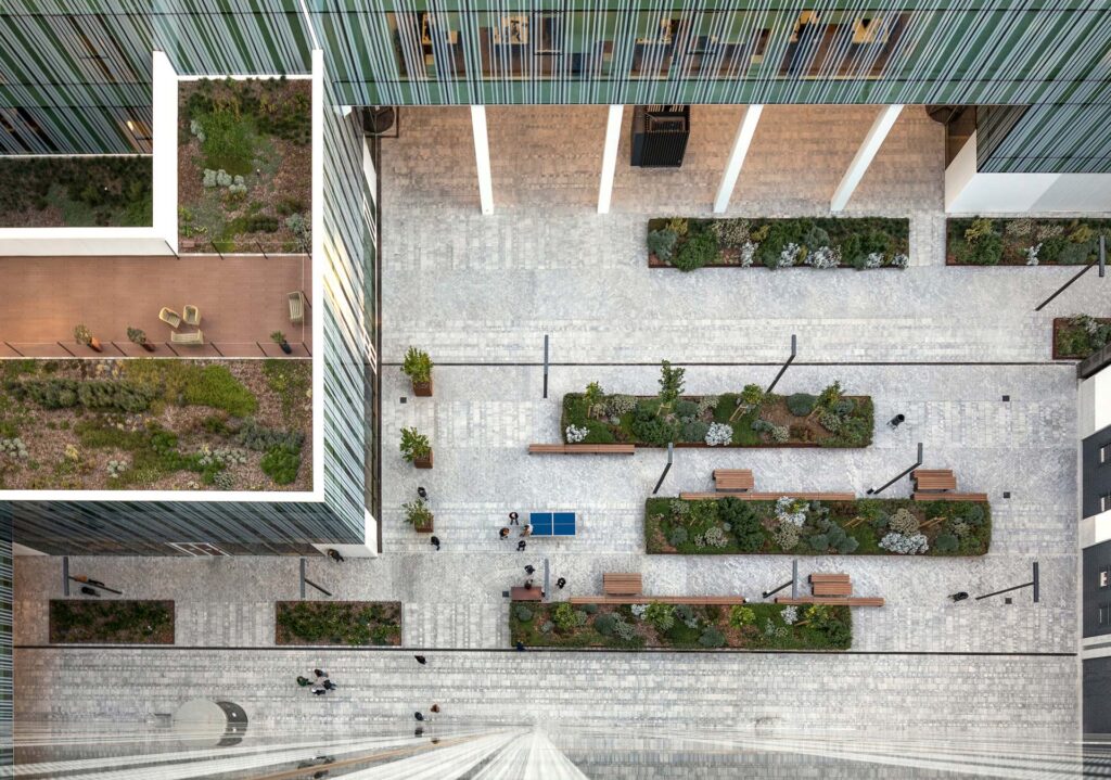 The project includes the development of the area around the buildings, located above the car park: A network of planters and benches, planted with indigenous species, provides shade and visual comfort for users, organises pedestrian movements and acts as a place of welcome and rest.