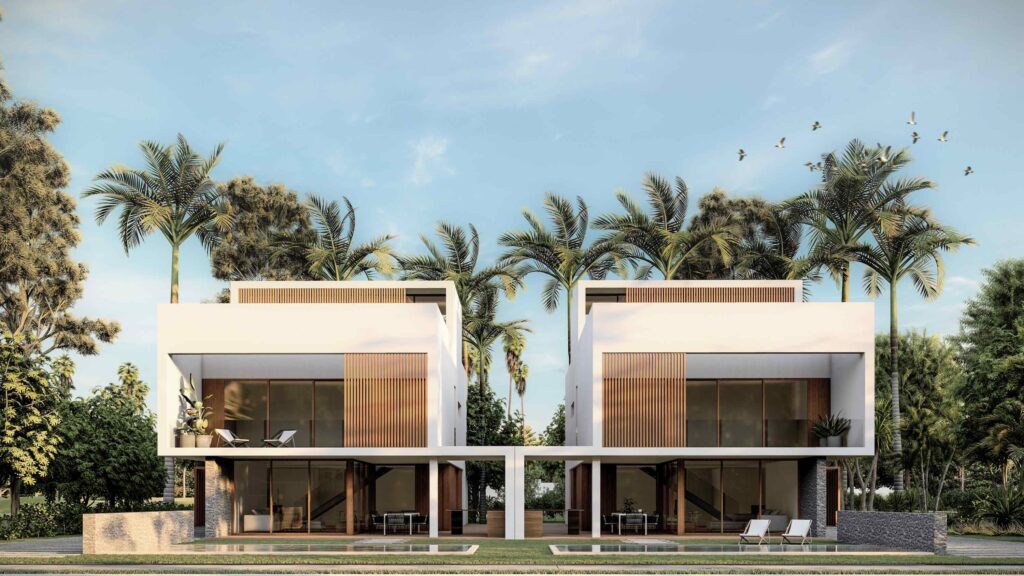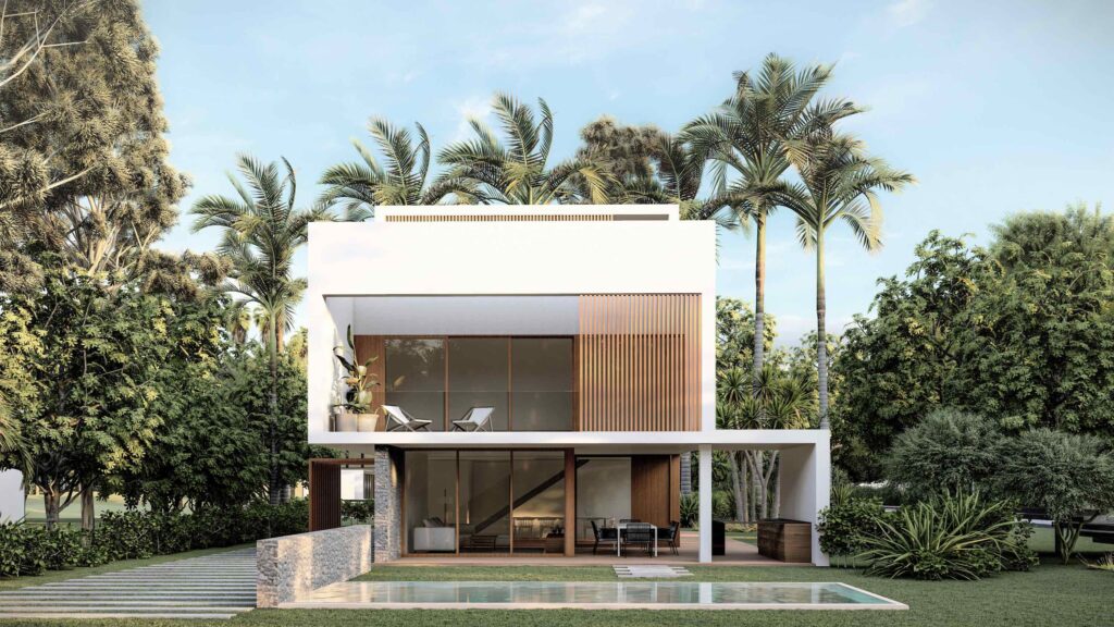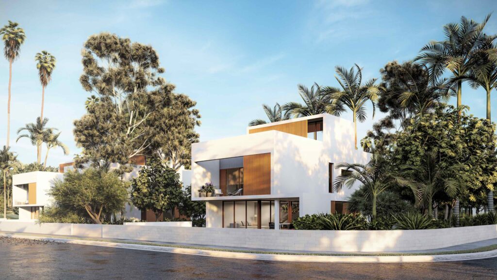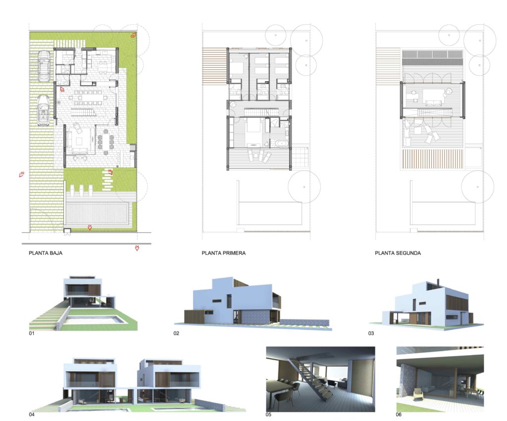 In the project for a condominium of more than 200 plots, the owner commissioned us to design a standard house as an element to be repeated throughout the complex. Given that the plots are not very large in terms of surface area for the extensive programme of the houses, the project develops a system that combines different possibilities for the location of the building in order to optimise the use of the garden. These combinations generate a set of façades which, when the houses are joined by the pergolas, form highly evocative shadow effects.